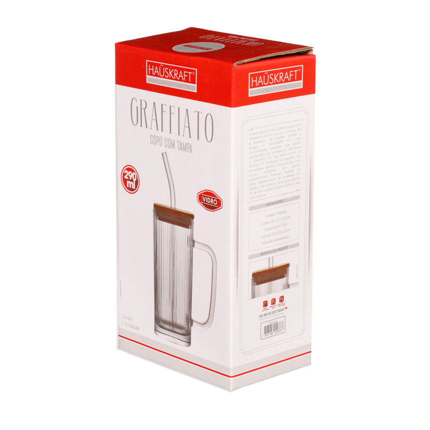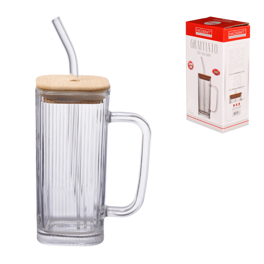 CANECA DE VIDRO QUADRADO COM TAMPA DE BAMBU E CANUDO GRAFFIATO 290 ML - HAUSKRAFT